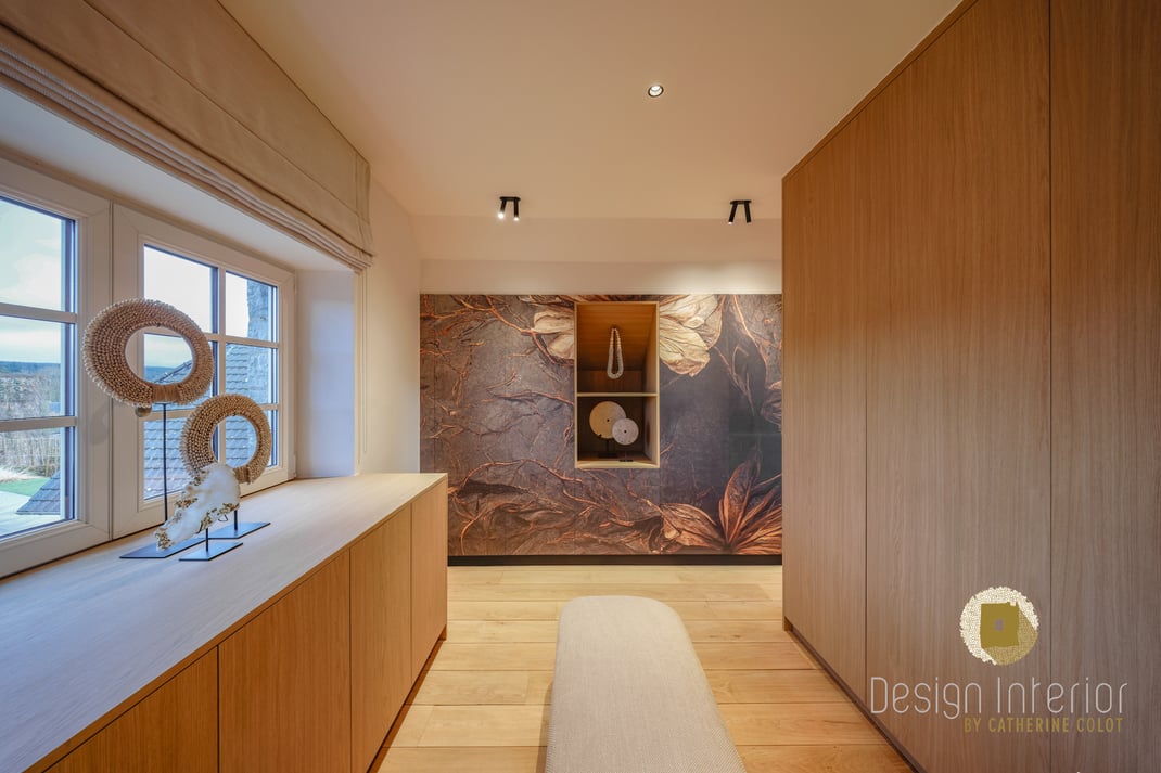 Pour masquer visuellement cette zone de rangement tout en lui conférant une identité forte, nous avons habillé les portes du dressing d’un revêtement vinyle effet panoramique. Ce choix permet d’intégrer subtilement cet élément architectural tout en préservant l’unité de l’espace.